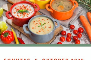 Feiern Sie nach dem Gottesdienst zu Erntedank um 11 Uhr gleich weiter. Genießen Sie die leckeren und ganz unterschiedlichen Suppen, die fleißige Menschen zubereitet haben. Und genießen Sie die Gemeinschaft und das Zusammensein. Herzliche Einladung!