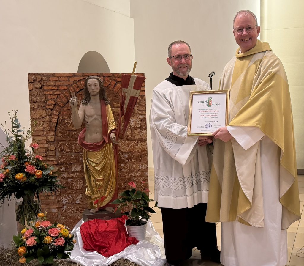Im Anschluss an die Abendmesse am 17. April 2026 würdigte Pfarrer Dr. Heiko Merkelbach dieses langjährige Engagement. In einem feierlichen Rahmen überreichte er Manuel Moreira die Ehrenurkunde des Mesnerverbandes sowie die silberne Ehrennadel.