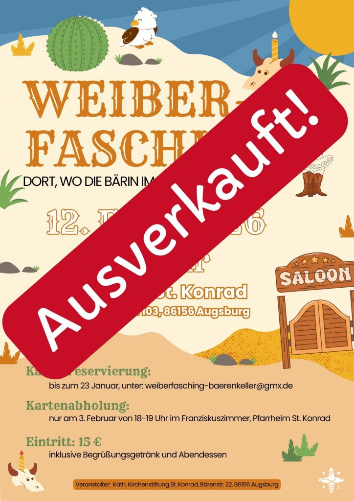 Eine Kartenreservierung ist bis 23. Januar 2026 unter der Emailadresse weiberfasching-baerenkeller@gmx.de möglich. Die Abholung der Karten erfolgt am 3. Februar 2026 von 18-19 Uhr im Franziskuszimmer im Pfarrheim St. Konrad.
