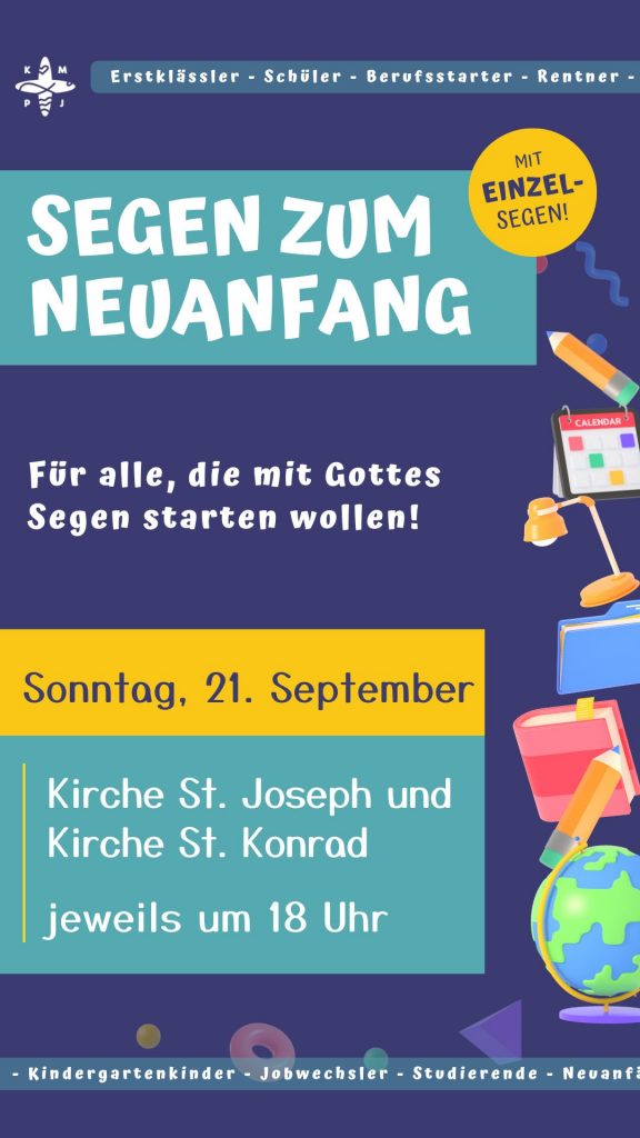 Herzliche Einladung zu den Gottesdiensten mit Einzelsegen am Sonntag, 21. September 2025 jeweils um 18 Uhr, entweder in der Kirche St. Joseph oder in der Kirche St. Konrad.