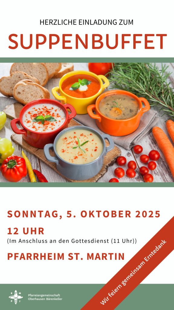 Feiern Sie nach dem Gottesdienst zu Erntedank um 11 Uhr gleich weiter. Genießen Sie die leckeren und ganz unterschiedlichen Suppen, die fleißige Menschen zubereitet haben. Und genießen Sie die Gemeinschaft und das Zusammensein. Herzliche Einladung!
