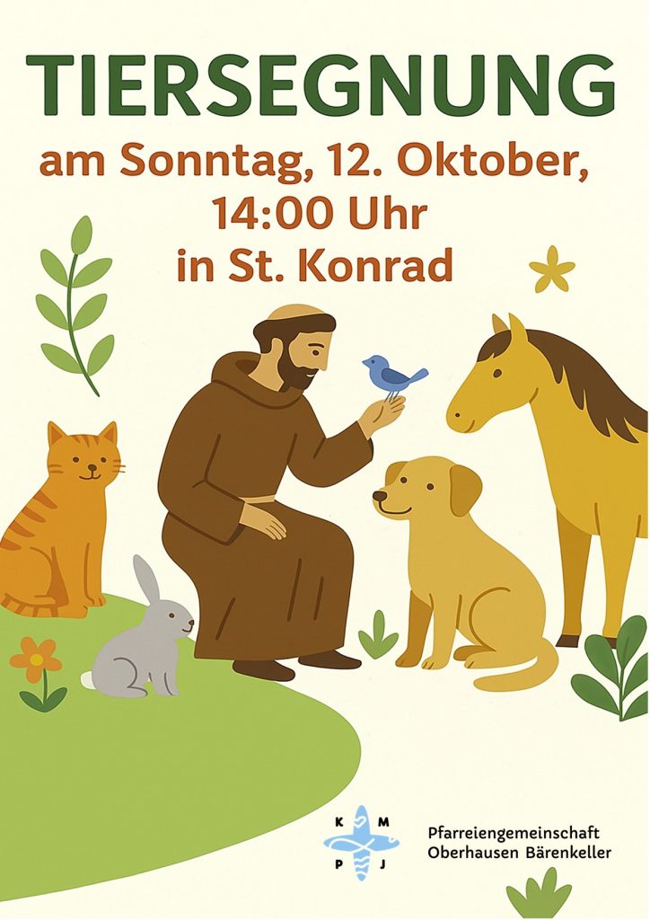 Am Sonntag, dem 12. Oktober, laden wir um 14:00 Uhr alle Tierfreunde mit ihren „Lieblingen“ herzlich in die St. Konrad-Kirche zu einem Segnungsgottesdienst ein. Kleinere Tiere (bis etwa Hundegröße) können mit in die Kirche gebracht werden. Größere Tiere – wie Esel oder Pferde – warten bitte auf dem Vorplatz, wo sie im Anschluss an den kurzen Wortgottesdienst gesegnet werden.